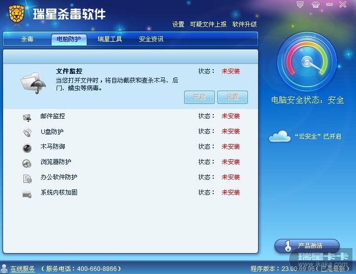 杀毒软件的电脑防护档显示:电脑防护未安装。 一流红字体。咋回事?