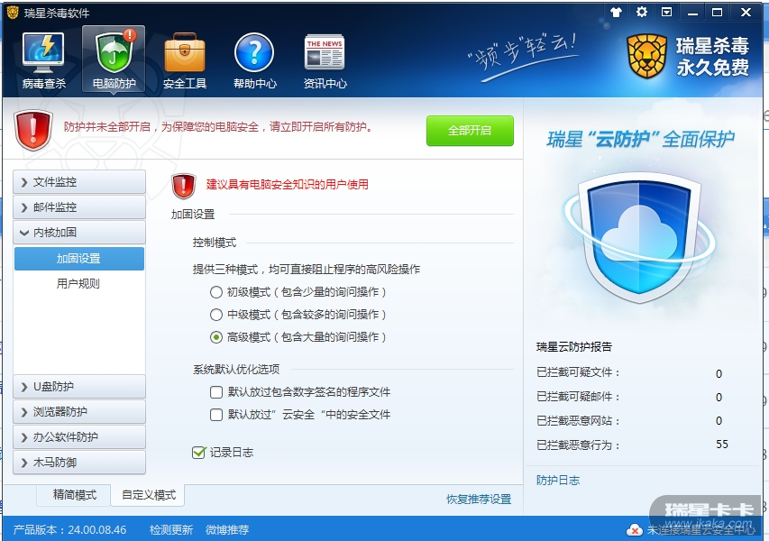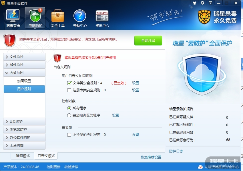 补充一下:在最初安装V16设置内核加固时 D:\Program Files\设置规则曾经有效过。在前两天整理磁盘时忽然发现失效的。之后卸载V16删除目录再安装v16都不再有效了。另外曾经安装和卸载过avast internet security软件。因为规则发现失效了就安装2011版瑞星并做了镜像,所以原来的系统日志已不存在。 现在我用的瑞星2011内核加固对 D:\Program Files\设置是有效的(对这个目录下的任何修改创建删除都会被瑞星拦截。并且安装avast internet security软件两者功能都正常。