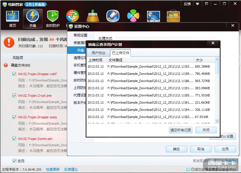 http://bbs.ikaka.com/showtopic-9217480.aspx还是有问题,精睿11日包瑞星显示清除112个,瑞星清除后的文件,管家报毒89个,未知文件上传22个。