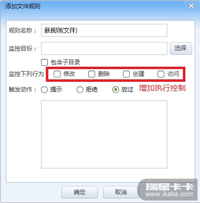 建议在内核加固用户文件规则自定义中,不要只提供“访问”“新建”“删除”“修改”这四个动作进行监控,应该在用户文件规则中加一个拦截项目“执行”,这样就避免了用户选择拦截“访问”后提示过多的问题,相当于应用程序执行控制。