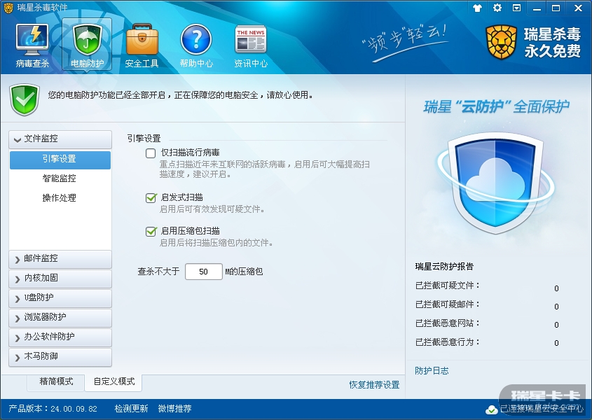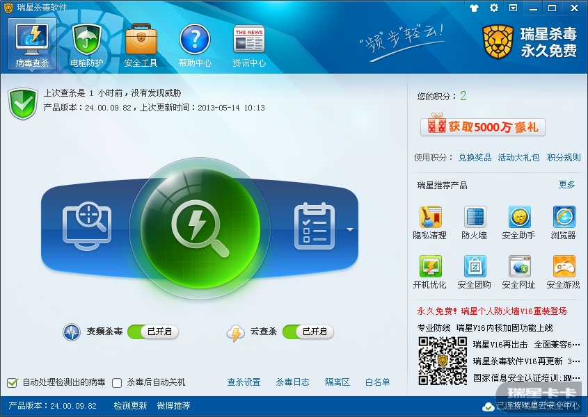 瑞星杀毒软件V16信息:软件版本:24.00.09.82(病毒库版本:24.62.00.02)