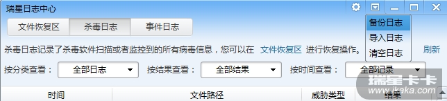 请提供操作系统类型(32位or64位)、瑞星杀毒软件版本、瑞星日志db文件等信息。日志提取方法:鼠标右键托盘处小绿伞图标>>查看日志>>右上角倒三角功能菜单处选择备份日志,将生成的db文件压缩发来。如下图: