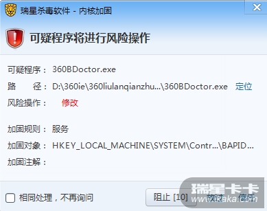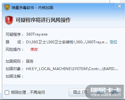 本人Pc前几日装系统,新装的是瑞星杀毒软件V16+,瑞星个人防火墙,以及360安全卫士,今天开机总是提示“可疑程序进行风险操作”,涉及到搜狗输入法,360safe.exe等等,不知道为什么,系统加固我设置是的高级,但不是今天才开始设为高级的,以前为什么没提示“可疑程序进行风险操作”????