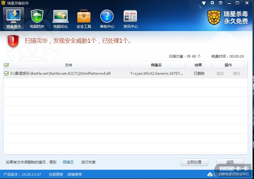 瑞星V16 24.00.13.47 会显示暴雪战网客户端中的一个文件为木马,删除后客户端无法使用,我重新安装客户端依然会显示发现木马,是不是误杀啊?