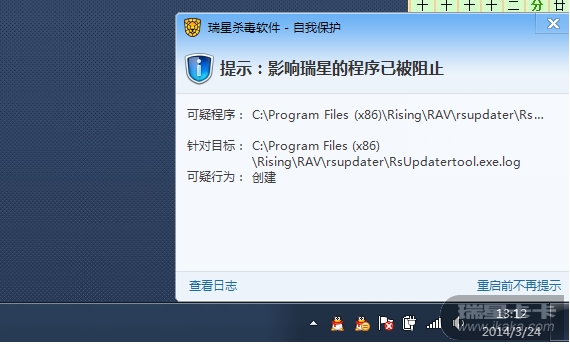 老是在右下位置弹出这个提示框,“响瑞星的程序已被阻止”,文件是RsUpdatertool.exe.log