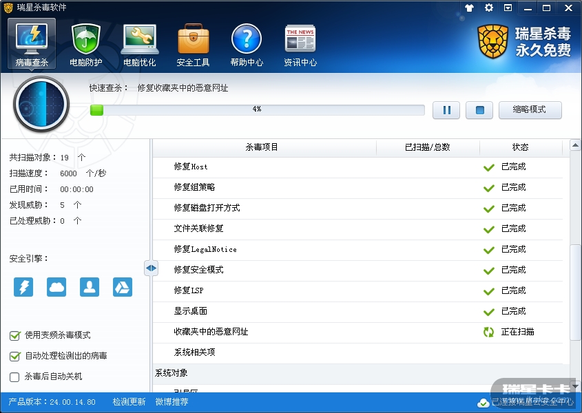 最近才出现的问题:每次杀毒的时候,都会在进度4%(扫描19个)的时候“收藏夹中恶意网址”的位置处停住不动了,尝试过软件修复、卸载后重装,还是没办法决解,重复好几次,每次都是同个位置停住,