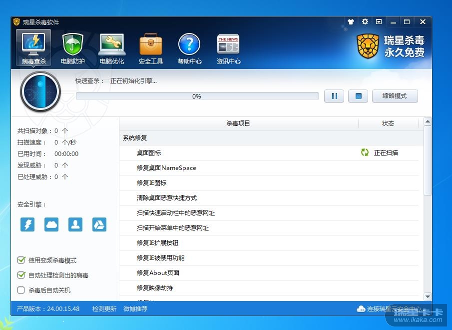 我打开瑞星快速查杀后,一直显示正在初始化引擎,过了1个多小还是正在初始化引擎。
