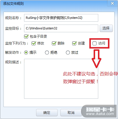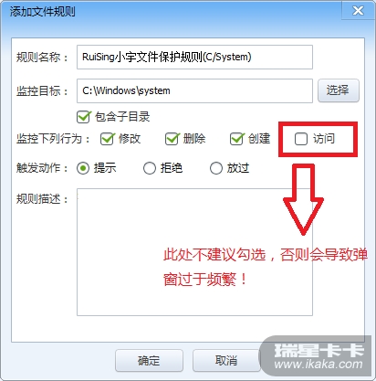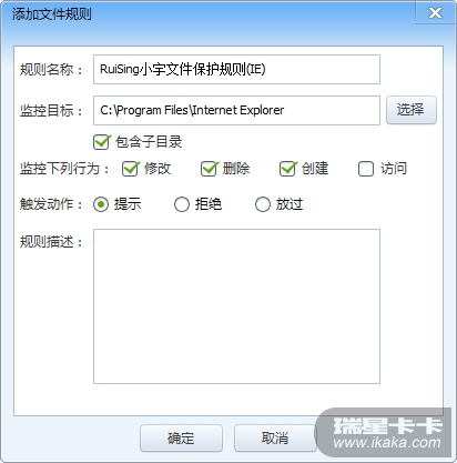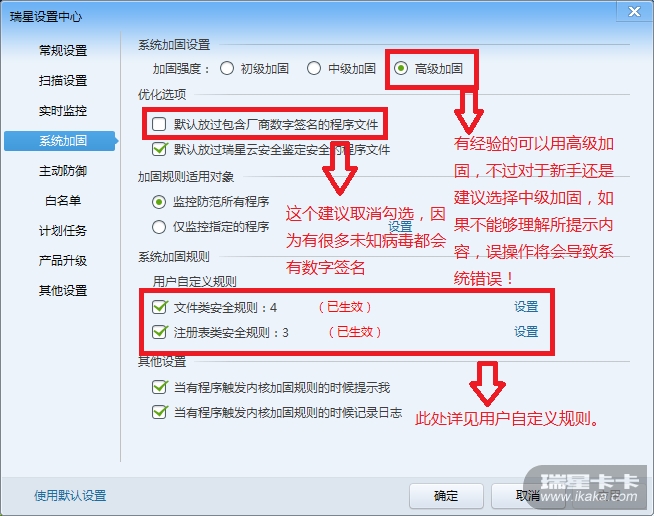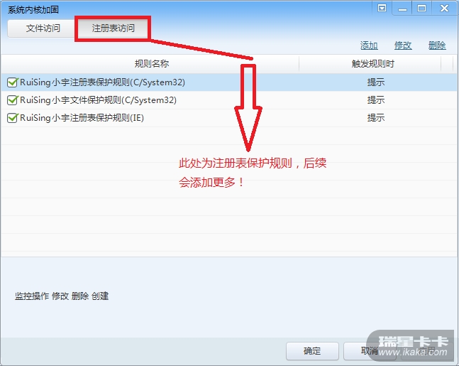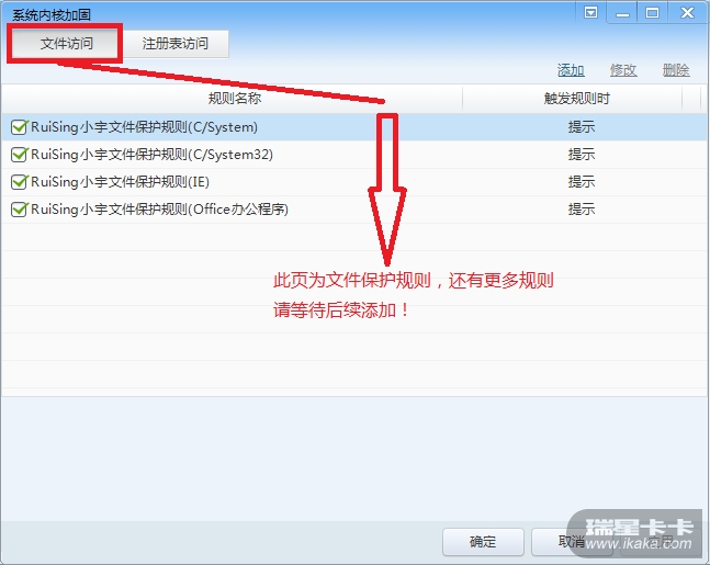 请注意!经本人的WIN7系统实机测试,发现RuiSing小宇注册表保护规则(C/System/32)过于严厉,会造成询问过于频繁,请谨慎使用,或不推荐使用。此问题后续将会修改。请注意!如果您的系统是XP系统,那么RuiSing小宇文件保护规则(IE)的文件路径为:C:\WINDOWS\ie8(其它特殊情况自行判断。)