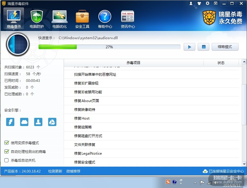 1、“杀毒项目”中的“状态”没有显示“已完成”的字样;