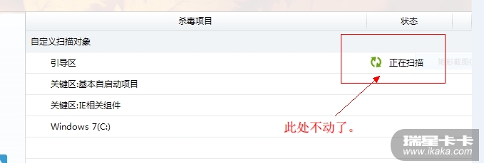 打开瑞星主界面 --》 选择自定义查杀 --》任选两个或以上的查杀位置,在查毒界面出现问题:无论扫描进行到何处(到扫描完成前),扫描的“状态”一栏永远停在查杀第一项的位置,且显示“正在扫描”提示不变(即下面的查杀项目和状态部分不动了)。请客服12确认是不是Bug,谢谢!