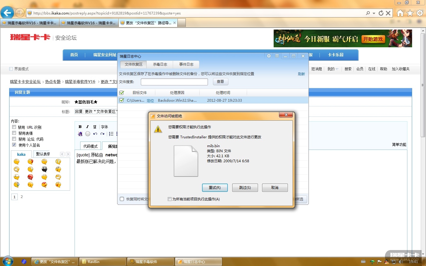 xp系统测试一下,修改为c:\windows目录没有触发自我保护。文件访问被拒绝的是win7系统嘛?还有将文件恢复区路径设置为什么路径了?