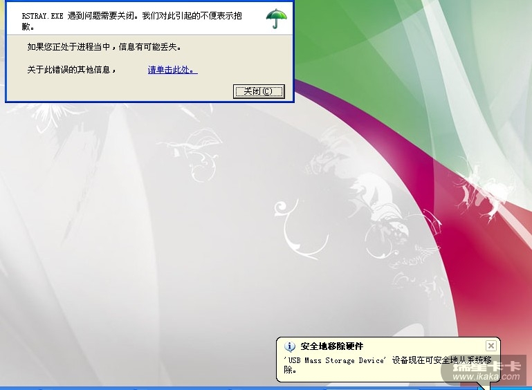 最近一段时间都会弹这个RSTRAY.exe遇到错误需要关闭.点关闭之后,右下角的伞没了.