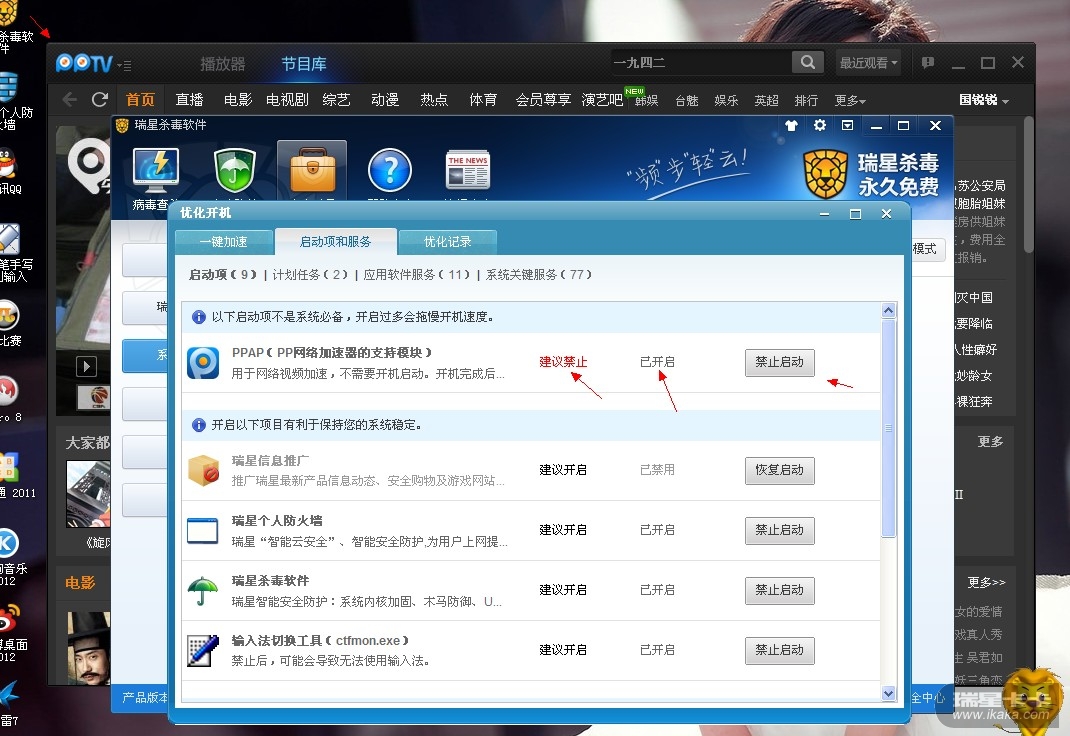 开机忧化禁止是成功的,可是一启动我的禁止软件瑞星又要重新,开机忧化禁止的。真是没完没了的烦恼。别人的安全软件到是永久禁止,你们瑞星人员技术真是好差水,这个问题不是现在刚开始有的,一直到是现在我用烦了才来告示你们,你们技术很水阿,有时真是怀疑你们是一群新手大学生。也是不知你们瑞星自己人有没有用自己的产品这点怀疑很大。为什么你们就不能发问题再先呢?