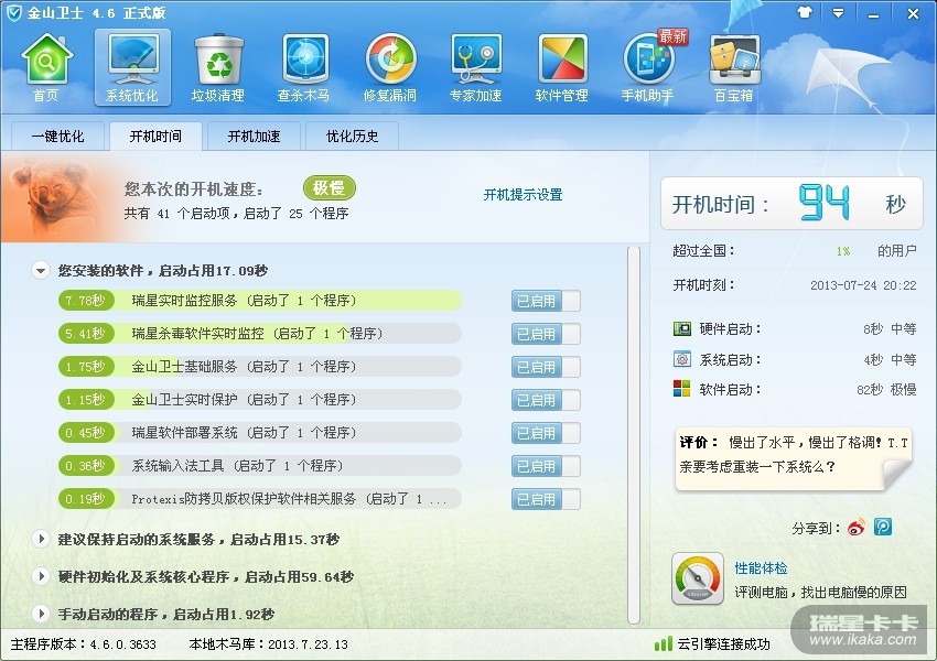 今天晚上我一开机,发现卡在即将显示图标的那一刻,桌面只剩一幅画。后来经过金山卫士查看知道原来是瑞星V16拖慢了开机速度!看图系统:Windows xp sp3