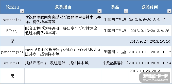 为答谢星迷们一直以来对瑞星产品的厚爱,即日起每周推选一位在热点专题、产品求助、以及技术交流这三大板块中最活跃的狮子,瑞星将对这些辛勤的狮子们给予丰厚的奖品作为回馈。奖励名单每周五更新一次。如本周没有合适人选则空着,奖品为后面的狮子们准备着!