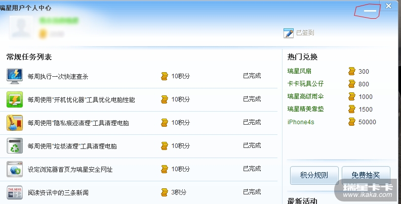 瑞星用户个人中心,右上角建议加个最小化 按钮。不光好看,也有可用之处。