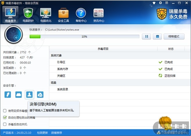 最新推出的瑞星杀毒软件V16+采用了四核杀毒引擎,大幅提高了病毒查杀能力