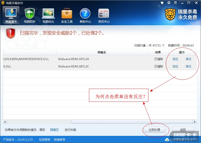 如图,在一键杀毒之后,无论是点立即处理还是操作栏内的信任和定位都是没有反应的,应该是BUG,希望尽快修复下,不要让这些小细节破坏了用户的体验。