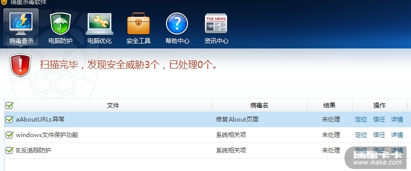 重做系统后。(安装QQ软件。股票软件。Office)做全盘杀毒出现的。提供样本我不会。再说也没什么样本啊。就是出现上述三个威胁。瑞星是新版本24.00.14.46