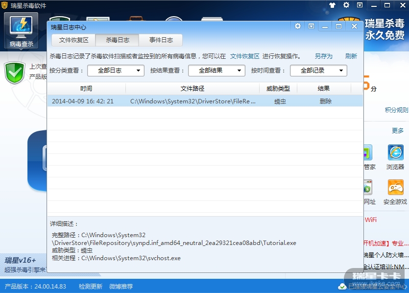 这个文件不知道咋的恢复了,再次扫描没有报毒,但是4月3号扫描的在隔离区还是有啊