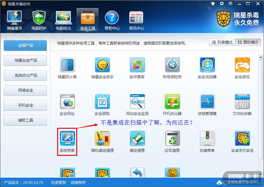 系统修复已经集成在扫描中,为何工具箱中还有呢?建议相关扫描选项毫无保留的集成在扫描中,并从工具箱中去除该工具图标