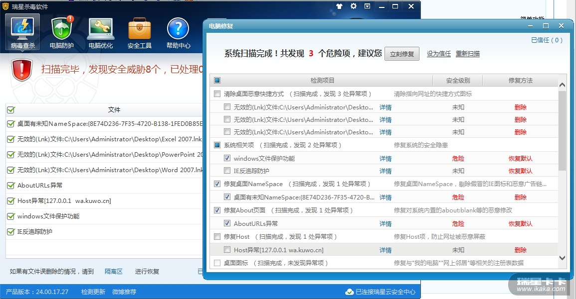 记得这款小工具在2012左右出的(看上图电脑修复界面多像2012版软件),但却一直沿用,没有更新,还在v16+中集成到快速查杀里,而Win8.1,2013年出的,导致现在产生以下问题(测试环境Windows8.1 x86)