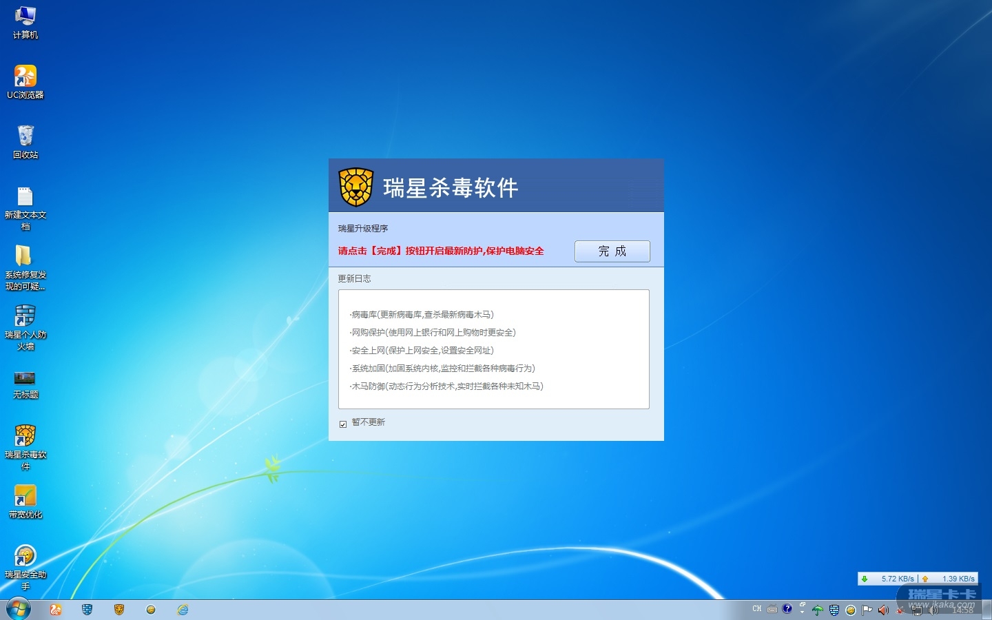 这个弹窗是提示您是否设置瑞星安全网址为主页。如果您不想设置,请勾选暂不更新,再点完成。