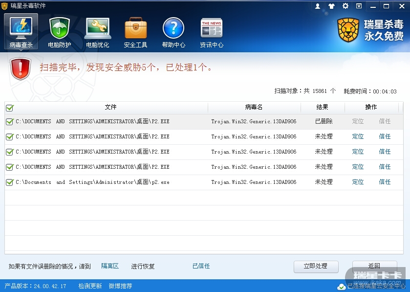 估计是 真实的病毒就是有一个,但是瑞星显示了多个,只有一个是真的,其它的都是不存在的,所以瑞星处理时找不到,然后自杀了