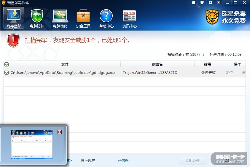 1、瑞星文件监控,一直 报警,并提示清除成功,但是一直不停的发现同一个病毒文件