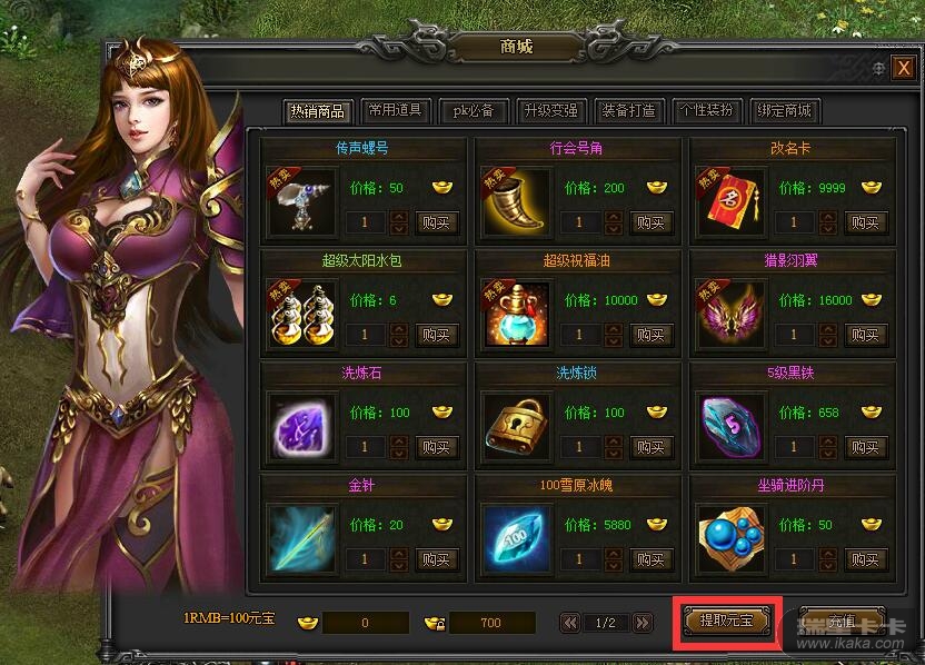 2、在商城界面的右下角点击提取元宝,充值元宝即刻到账。