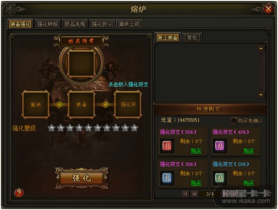 装备强化:游戏中装备可通过使用对应等级的黑铁进行强化,使用强化符文可提升强化成功概率哦!