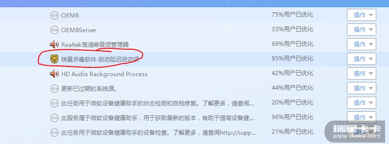 你是不是把瑞星的“延时加载启动项”给禁用了,在不推荐优化的计划任务里面