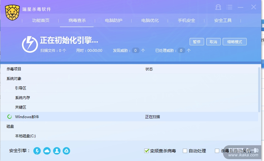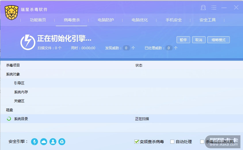 全新安装的系统,瑞星用的好好的,两天不到突然出问题了。(没有装其他安全软件,只有瑞星的杀毒和墙)点击扫描,一直在初始化引擎,并且无法暂停或者停止扫描~~!!!只能点击右上角叉叉才能关闭,如果进行右键扫描,那么缩略的扫描进度条一直停留在百分之零!并且这个缩略进度条无法点击暂停和关闭!!!