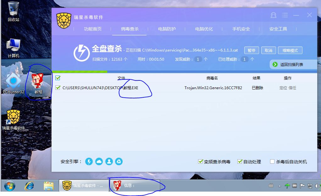看看任务栏 ,明明 病毒进程还在 ,但是 瑞星 枚举 有问题 , 很不稳定, 一会 枚举正常 ,一会 枚举时 就存在漏毒的情况!!!