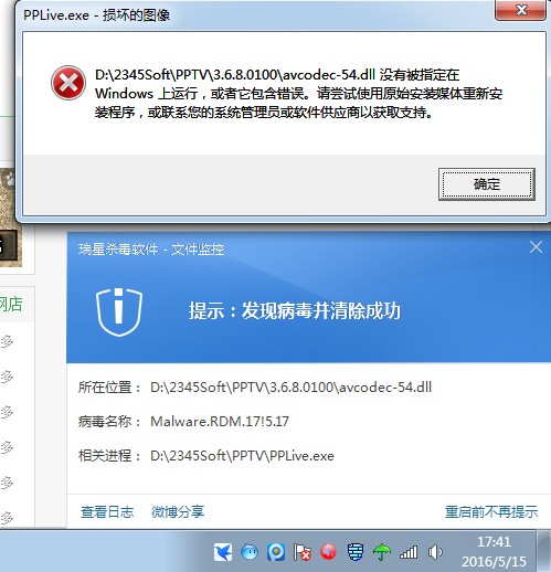 开启PPTV播放软件时,瑞星V17有误报的现象发生。(如图所示)
