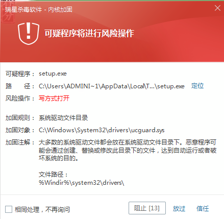 随便找了一个带捆绑的下载程序,试了一下,效果不是很理想,以下截图按时间顺序发生,所有报警均阻止(忽略了最开始的文件监控报警,那不是重点):
