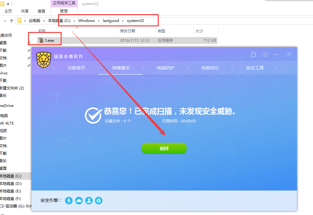 这个路径下,1.exe也隐身了,瑞星发现不了