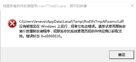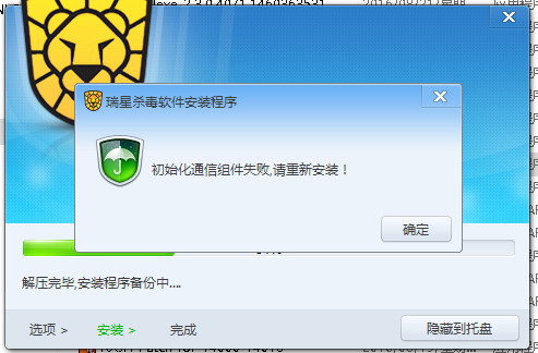 安装瑞星最新版本的ravv17std 瑞星杀毒软件完成后,立即出现报错提示窗。