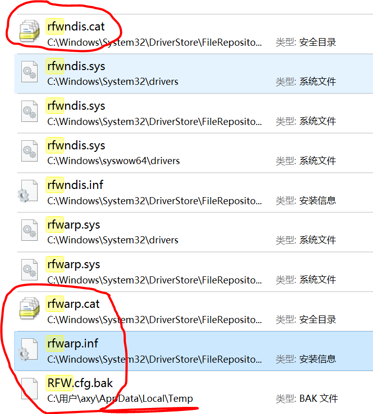 它们在这个目录下:C:\Windows\System32\DriverStore\FileRepository\rfwndis.inf_amd64_1b542a1ca8617979