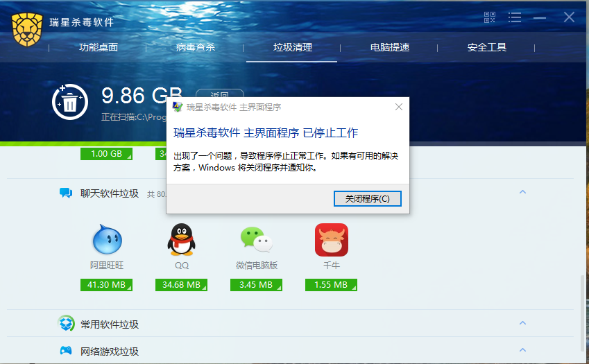 瑞星杀毒软件,清理垃圾功能,半途崩溃,一直是这样