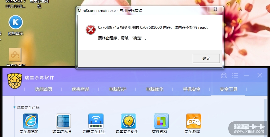 操作系统:windows 7 64位旗舰版,瑞星版本:24.17.00.591.如图5中BUG无法显示迅雷影音软件,2.手机内存清理卡在8图中画面。