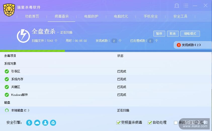 1、全盘时 ,瑞星卡住了 ,说明 病毒 干扰 引擎 扫描 !!!