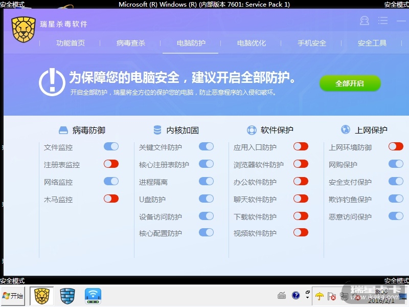 [软件冲突] 瑞星杀毒软件V17在安全模式下电脑防护中有许多项不能开启,绿伞变成了黄伞。