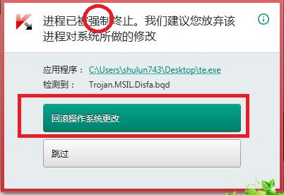 卡巴 居然杀掉了 病毒进程,并且 干掉了 桌面上病毒的文件!!! 并提示 回滚 病毒 操作 ,太周到了!!!