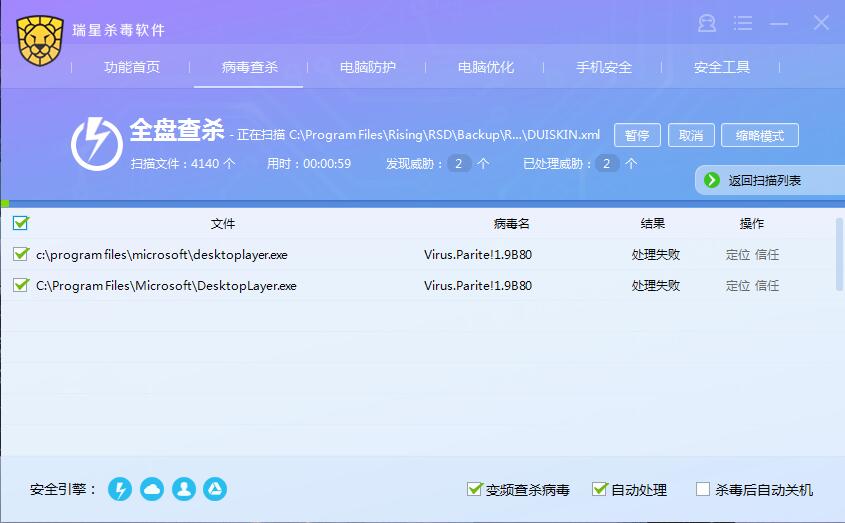 3、文件监控 或 全盘扫描时 ,没有处理病毒线程 感觉是不对的,建议改进,希望能处理