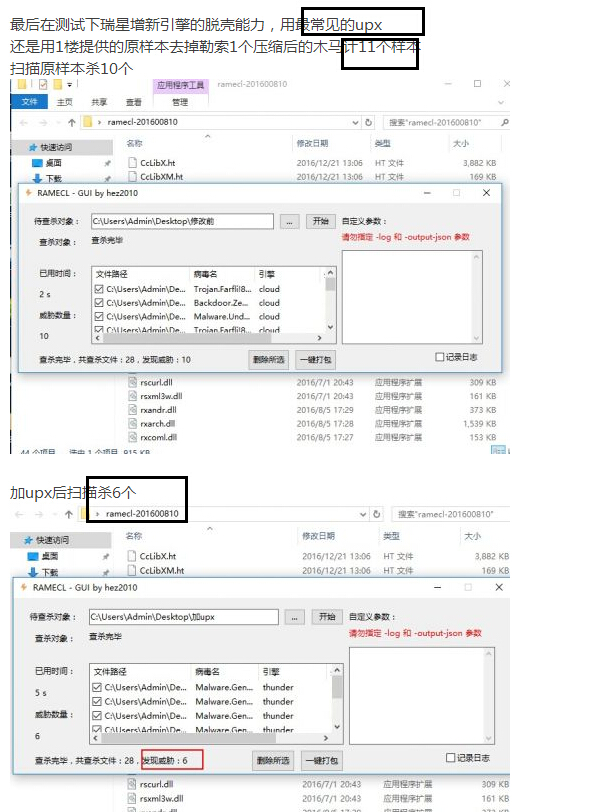 2、新引擎 无法处理 脱壳 , 加壳后 , 瑞星识别 失败!!!