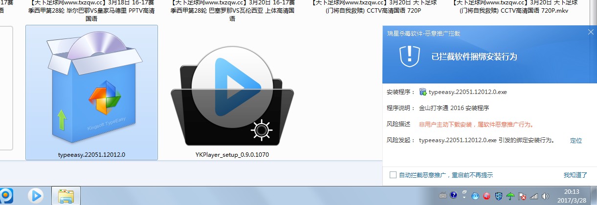 安装金山打字通2016软件时,遭遇到了拦截提示的现象。(如图所示)