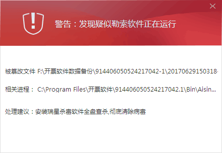 税局发票软件被认为勒索病毒, 用户一旦作出备份数据的操作,就会被瑞星之剑删除备份数据并杀死发票软件的进程。 另外,搜狗输入法也会被认为勒索病毒