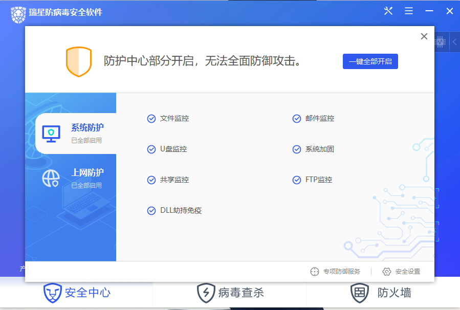 问题现象: 全部开启防护但是提示没开启,连接了网络提示没连接网络。