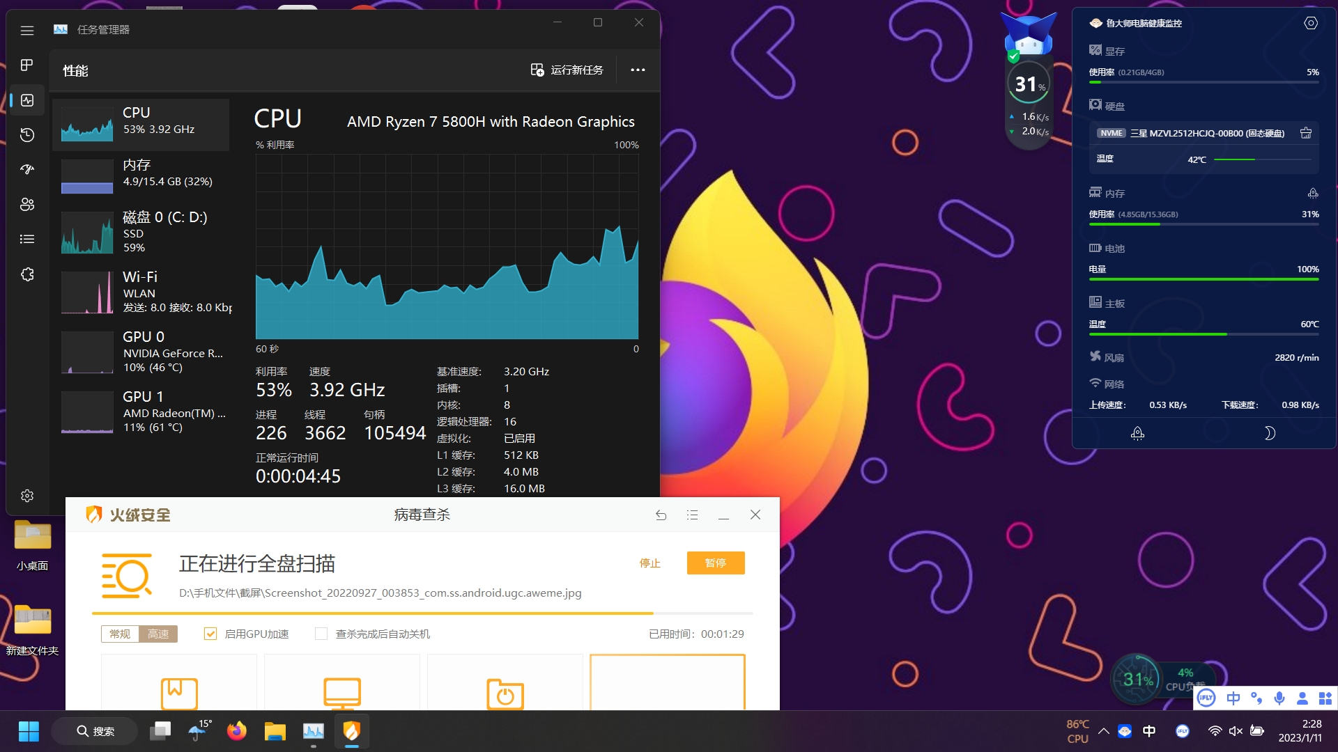 测试了下友商的GPU加速功能,出来AMD的优化还需要加强外,用NVIDIA加速,真的溜的飞起,同样的文件量扫码速度比瑞星的节约了一个小时。这功能真是小星星快开发起来,而且要默认打开的那种,不然以瑞星现在的扫描速度,女生用户、学生用户第一个先弃用。就连管家 毒霸都知道把UI做的更贴近年轻用户,真的要改进的地方太多了。